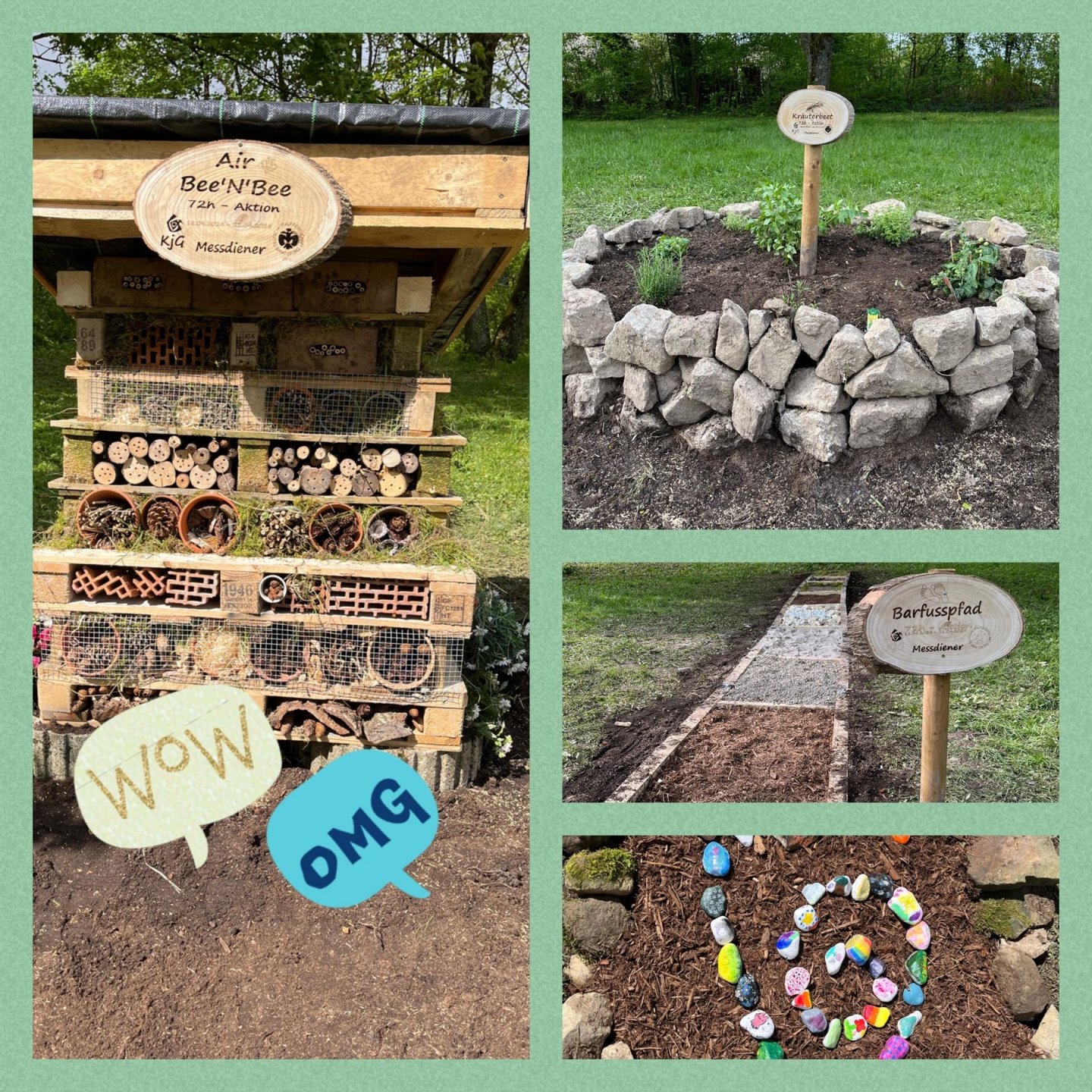 In der vergangenen Woche fand von Donnerstag bis Freitag die sog. 72h-Stunden Aktion unserer KJG statt. Es galt in 72h ein selbst gestecktes Ziel mit verschiedenen Aktionen zu erreichen. Die Jungs und Mädels hatten sich vorgenommen unsere Weiheranlage um ein paar Attraktionen zu erweitern und das Ergebnis ist der Wahnsinn. Bei teils strömenden Regen haben die vielen Helferinnen und Helfer ein großes Insektenhotel gebaut, einen Barfußpfad und eine Blühwiese angelegt und die beiden Kräuterschnecken komplett erneuert. Es lohnt sich wirklich, sich die Ergebnisse bei einem Spaziergang am Weiher anzuschauen! Ich darf mich vor allem bei den Jungs und Mädels der KJG, aber auch bei ihren Betreuern und Eltern und bei allen, die Material und co. gespendet haben, auf das Herzlichste für diesen Einsatz bedanken!