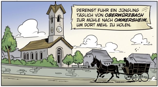 Weit bekannt und berühmt war die Schönheit der Jungfern aus diesem Ort und viele hatten schon versucht, das Herz einer Holden zu erobern – doch nur selten war es einem vergönnt, die Schöne in den Armen zu halten. Gar streng waren die ortsansässigen Burschen und nicht selten wurden blutige Fehden ausgetragen. Doch besagter Jüngling ließ sich hiervon nicht abschrecken und verband die Freierei in Ommersheim mit seinem Tagewerk, zu welchem er häufig Säcke mit Mehl von Ommersheim nach Oberwürzbach transportieren musste. Schon mehrfach wurde er von den Burschen des Ortes angehalten, die Ommersheimer Damen in Ruhe zu lassen, sonst würde es ihm schlecht bekommen – doch wo die Liebe hinfällt, da schweigt der Verstand.
