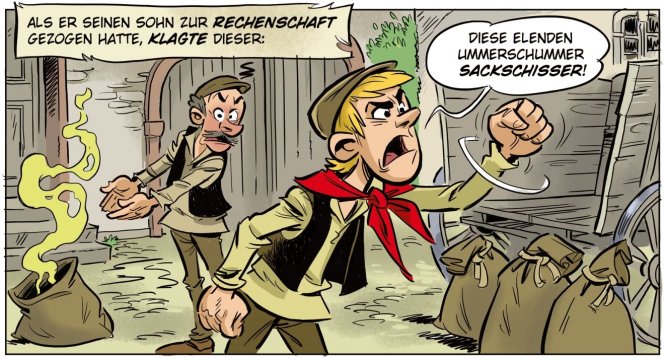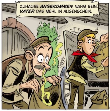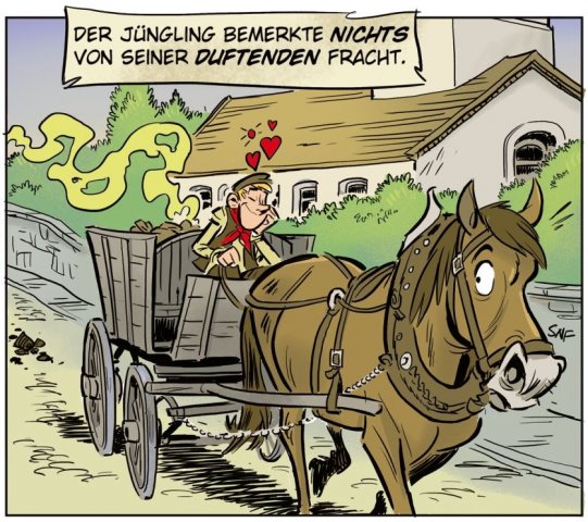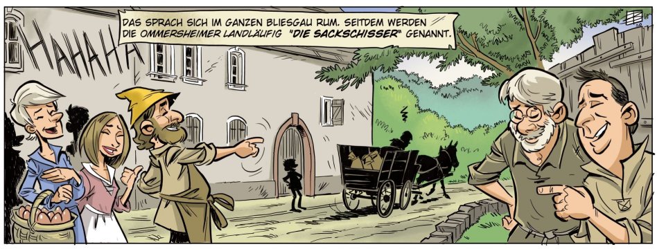 Und so kam es wie es kommen musste, als der Oberwürzbacher wieder einmal zu einem heimlichen Stelldichein bei seiner Liebsten weilte, hinterließen die Burschen im Mehlsack des Jünglings, ein Zeichen ihrer Wertschätzung, in höchst anrüchiger Form. Noch liebestrunken zog der Jüngling spät am Abend nach Hause und bemerkte nicht die duftende Fracht, die er auf seinem Rücken hatte. Erst zuhause, als sein Vater, angelockt von der neuen Duftnote des Mehls, dieses in Augenschein nahm, fiel es auch dem Jüngling wie Schuppen von den Augen. Die Ommersheimer Burschen hatten ihm in den Sack geschissen! Sein Wehklagen war laut und viele Leute in Oberwürzbach konnten ihn noch lange vernehmen mit seinen Worten „ Die Ommersheimer hann mir in de Sack geschiss, die Ommersheimer, die Sackschisser, die..“