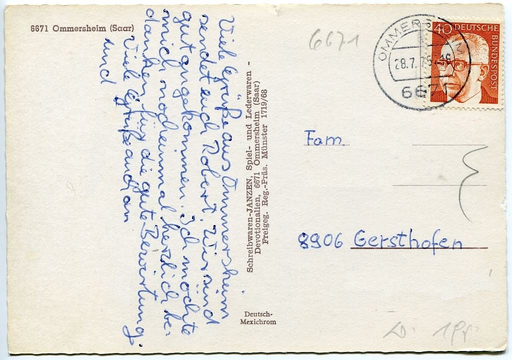 Zu Hause angekommen erzählte ich meinen Eltern stolz von meinem Erlebnissen und der netten Familie, bei der ich in Quartier war. Dem Hinweis meiner Mutter folgend, gut erzogen wie man hätte sein sollen, ging ich zu "Schreibwaren Janzen, Spiel-und Lederwaren, Devotionalien" und kaufte eine Ansichtskarte von Ommersheim.