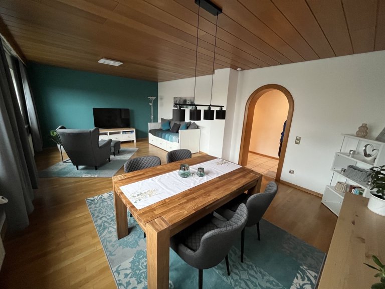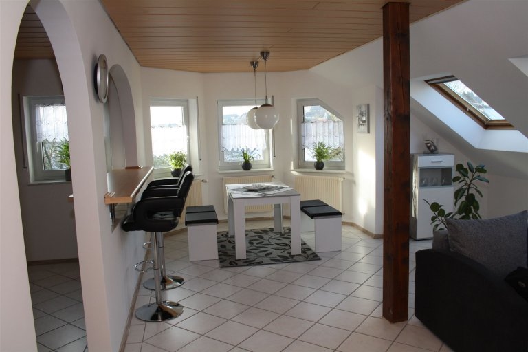 Unsere 140 qm große Ferienwohnung befindet sich in einem Zweifamilienhaus im Dachgeschoß. Sie ist hell, gepflegt, komplett neu renoviert und modern eingerichtet.