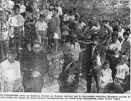 Der Brunnen, welcher bereits vor zwei Jahren nach einem Entwurf von Adolf Grauvogel angelegt wurde, war durch Robert Hofmann gründlich renoviert worden. In das Gestein des Brunnens hat man den Namen von Jakob Preiser, eine symbolische Lyra und eine Widmungstafel eingemeißelt. Der erste Vorsitzende des Musikvereins Ommersheim würdigte bei der Enthüllung die Verdienste des Ehrenpräsidenten. Ihm sei die Kapelle zu besonderem Dank verpflichtet. Nicht zuletzt durch seinen Opfergeist und durch sein Können sei die Kapelle weit über die Grenzen des Saarlandes hinaus bekannt geworden. In diesem Jahr habe sie bei einem Treffen der Musikvereine in Wien den ersten Preis davongetragen. Bürgermeister Weis sagte dem verdienten Ehrendirigenten herzlichen Dank dafür, daß er Ommersheim zu einem so guten „Klang“ verholfen habe.