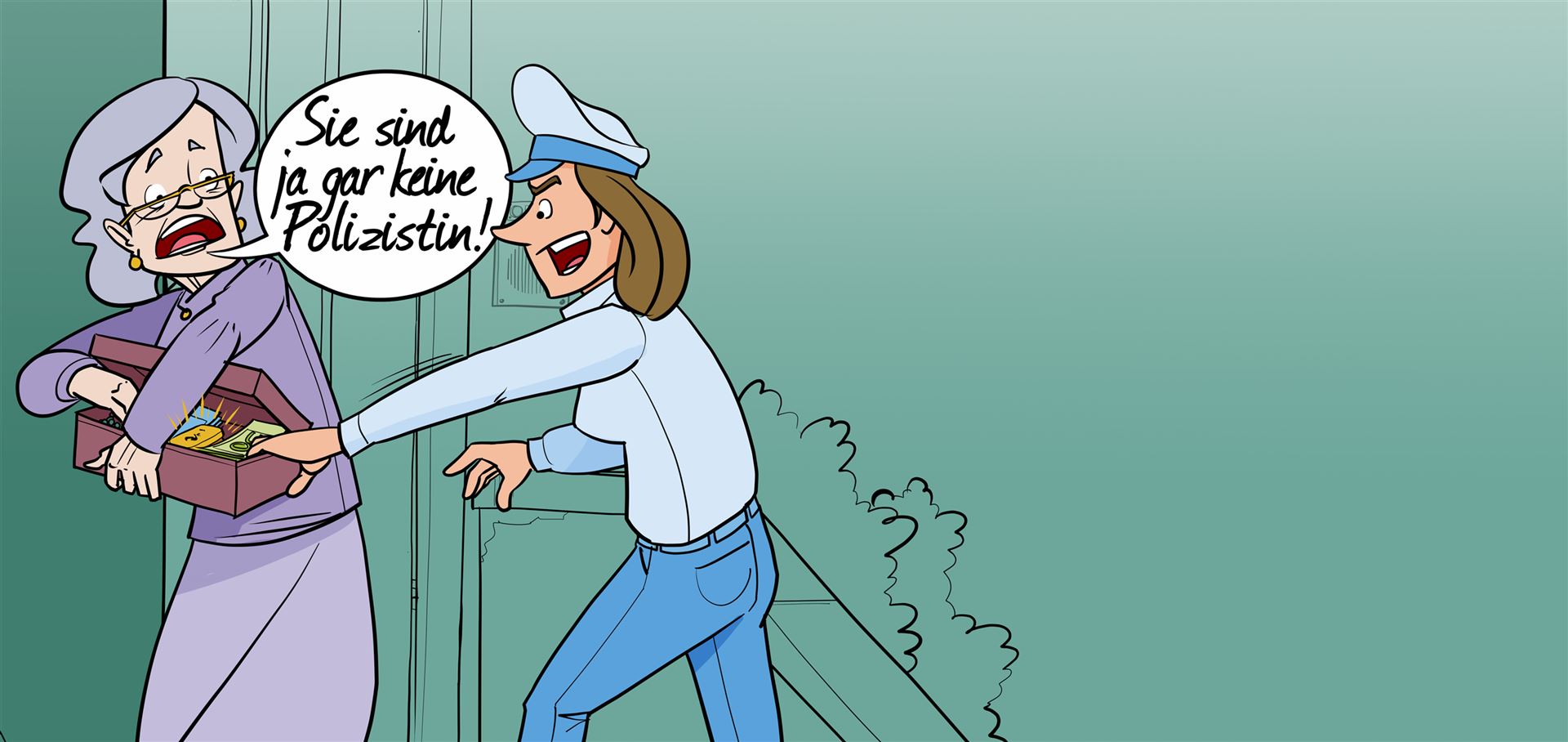 Langsam wurde die 73-Jährige misstrauisch und äußerte ihre Bedenken. Der falsche Polizist erklärte Hildegard T. barsch, dass sie die Ermittlungen nicht behindern dürfe. Er erwarte von ihr, dass sie ihrer Pflicht zur Mitwirkung an den polizeilichen Maßnahmen nachkomme, sonst müsse die Kosten des Einsatzes tragen. Noch während des Telefonats klingelte es an der Haustür. Dort stand eine Frau und forderte Hildegard T. auf, ihr das Geld und die Goldbarren auszuhändigen. Nachdem diese sich weigerte, kam es zwischen den beiden zu einem Handgemenge. Dabei stürzte die ältere Frau und verletzte sich. Die Täterin schaffte es noch, das Bargeld an sich zu nehmen und floh.