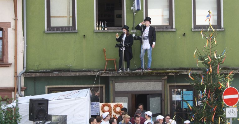 Symbolisch wird die Kerb' (eine Flasche Wein) im Vorjahr begraben und am Kerwewochenende Samstags Nachts ausgegraben und anschließend ausgerufen: Wem iss die Kerb'? Unser...
