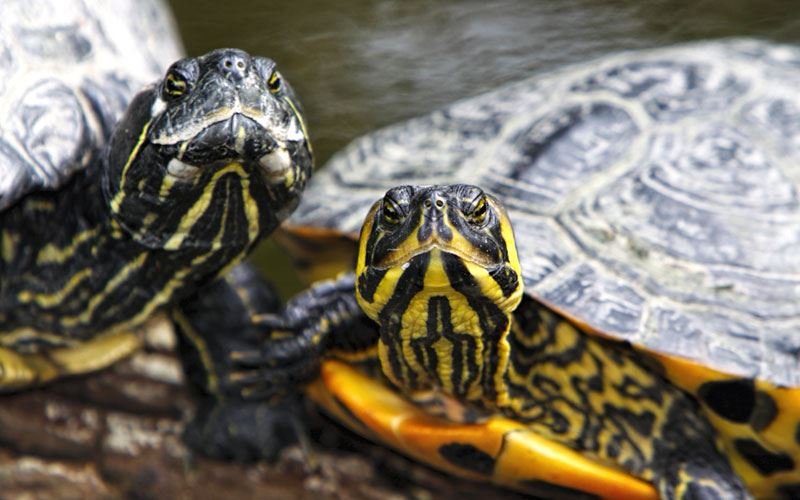 Unsere gepanzerten Freunde besitzen einen namensgebenden, gelben Fleck seitlich am Kopf und eine gelbe Maserung auf dem Panzer. Auffällig ist auch ihr leuchtend gelbes Bauchschild, welchem sie auch den Namen Gelbbauch-Schmuckschildkröte verdankt. Da man die Schildkröten meist von oben sieht und sie nicht selten auch etwas angeschmutzt sind, sieht man das gelbe Bauchschild aber nur sehr schwer.
