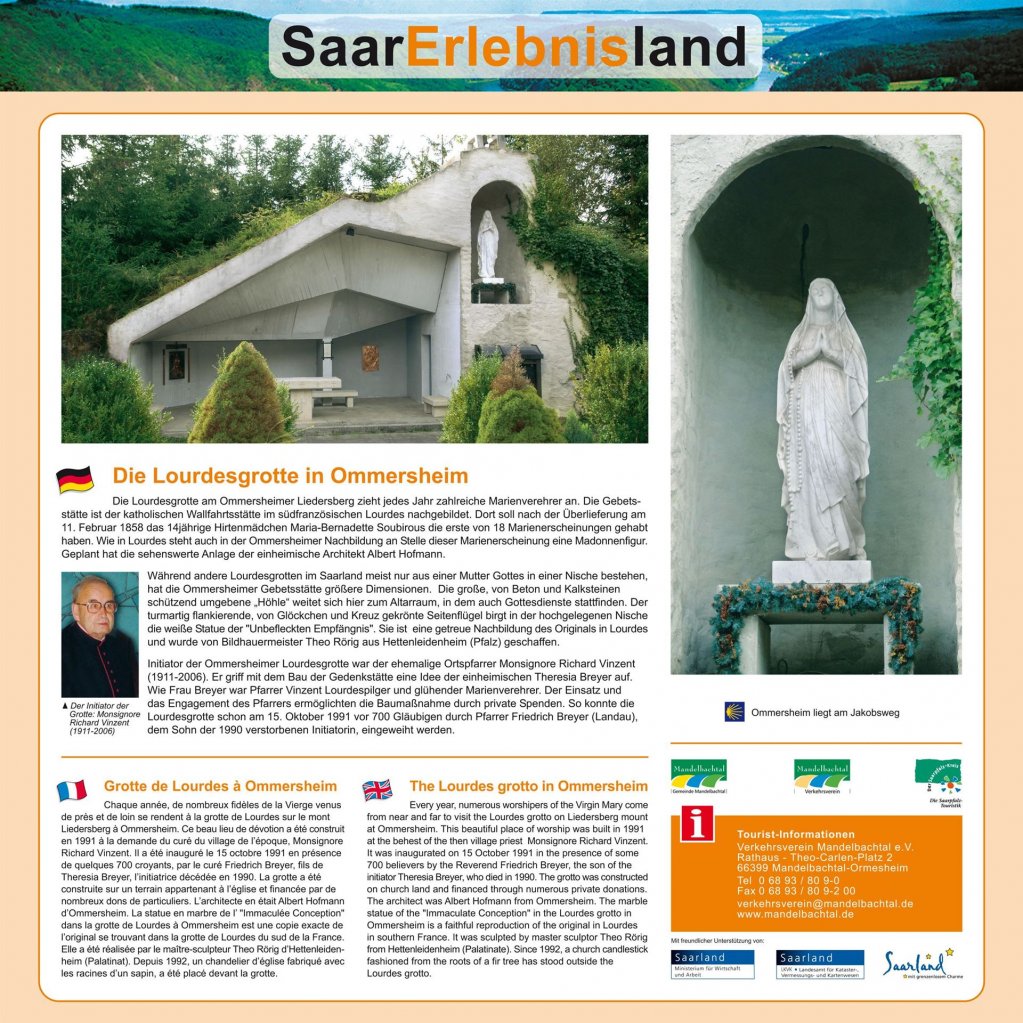Die Lourdesgrotte am Ommersheimer Liedersberg zieht jedes Jahr zahlreiche Marienverehrer an. Die Gebetsstätte ist der katholischen Wallfahrtsstätte im südfranzösischen Lourdes nachgebildet. Dort soll nach der Überlieferung am 11. Februar 1858 das 14-jährige Hirtenmädchen Maria-Bernadette Soubirous die erste von 18 Marienerscheinungen gehabt haben. Wie in Lourdes steht auch in der Ommersheimer Nachbildung an Stelle dieser Marienerscheinung eine Madonnenfigur. Geplant hat die sehenswerte Anlage der einheimische Architekt Albert Hofmann.